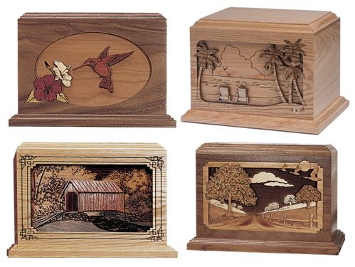 3D Engraved Urns -- Three-dimensional oak scenes with inlays and engraved details. 10 × 7½ × 6⅞" 200 cu. in. More designs available upon request.